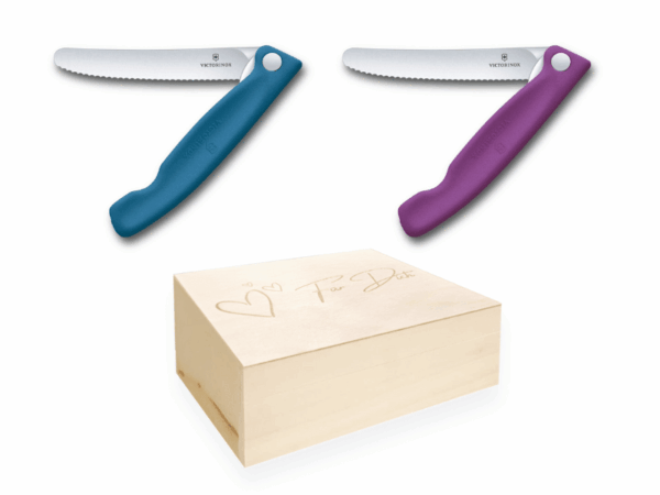 Das Set besteht aus zwei hochwertigen faltbaren Gemüsemessern in stilvollem Blau (6.7832.FC1) und Lila (6.7835.FC1) – symbolisch für Verbundenheit und Individualität. Verpackt sind die Messer in einer edlen Holzbox mit liebevoller „Für dich“-Gravur, die dem Geschenk eine persönliche und emotionale Note verleiht. Ideal als Valentinstagsgeschenk oder als kleine Aufmerksamkeit für deinen Lieblingsmenschen.