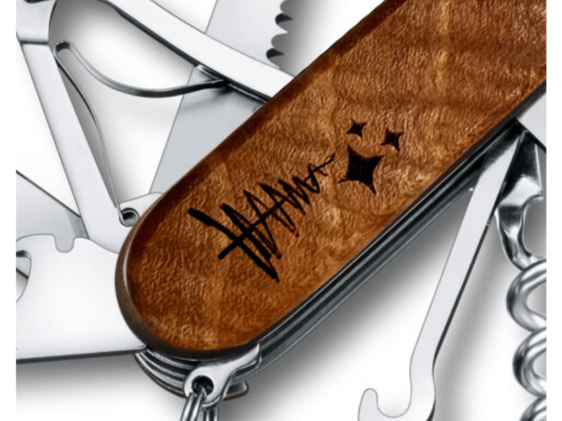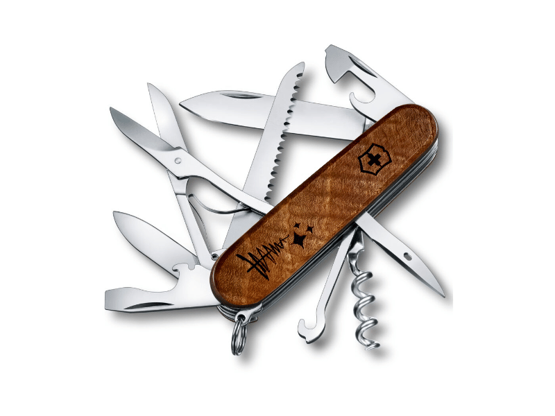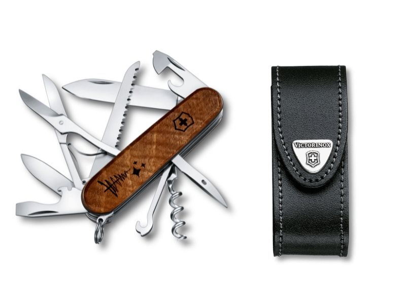 Im Zentrum steht das ikonische Victorinox Huntsman Wood Taschenmesser, gefertigt aus wunderschön gemasertem Nussbaumholz. Jedes Stück ist durch die natürliche Holzstruktur ein Unikat – stilvoll, robust und voller Charakter.
